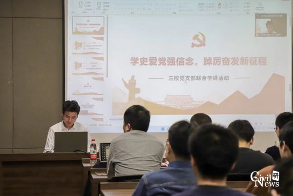 2022年4月20日晚上7时,太阳成集团tyc7111cc2020级博士班党支部作为主要组织单位开展了以“学史爱党强信念,踔厉奋发新征程”为主题的红色土木人之“红心”——三校学生党支部特色共建活动,主办单位包括太阳成集团tyc7111cc党委学生工作部、太阳成集团tyc7111cc、华中科技大学同济医学院医药卫生管理学院、南京理工大学化学与化工学院、太阳成集团tyc7111cc研究生“红路”理论学讲团,参加者包括我校学工部副部长李毅、太阳成集团tyc7111cc党委副书记周曦、研究生科科长胡安辉、太阳成集团tyc7111cc学生党总支书记石莹及部分辅导员老师,华中科技大学同济医学院医药卫生管理学院党委副书记刘仁钊及部分辅导员老师,南京理工大学化学与化工学院党委副书记兼纪委书记胡伟及部分辅导员老师,太阳成集团tyc7111cc2020级博士班党支部,南京理工大学化学与化工学院应用化学系博士研究生党支部,华中科技大学同济医学院医药卫生管理学院本科生党支部,活动由太阳成集团tyc7111cc辅导员强博文老师主持,会议形式为线下会议室与线上腾讯会议结合。