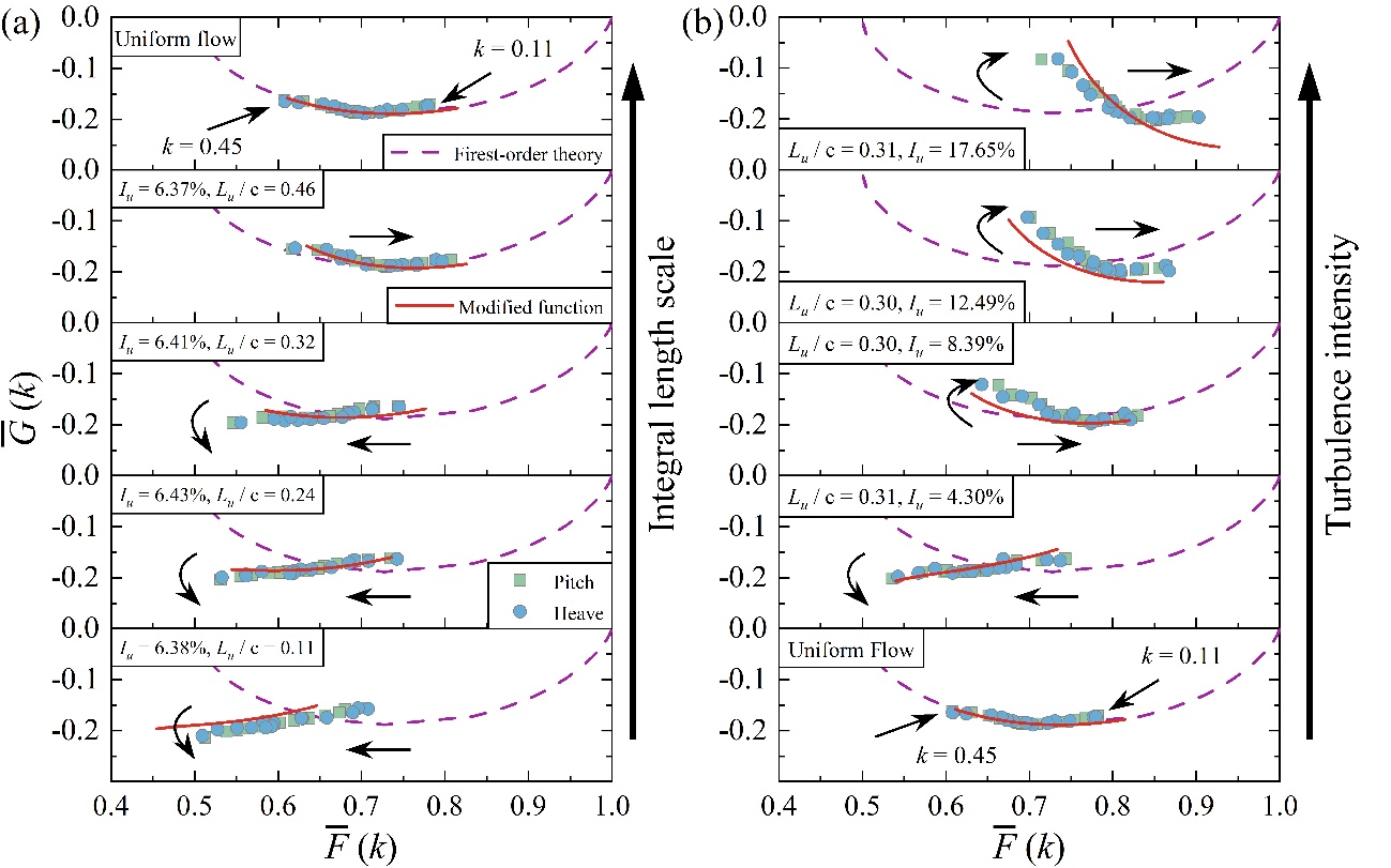 均匀来流下非定常气动力和颤振经典理论已经应用近百年。鉴于近年来风能、航空航天和土木工程技术的迅猛增长,人们越来越关注在湍流中振动结构的非定常气动性能。目前的大多数研究仍然基于势流理论获得翼型的气动力,这些模型已通过实验得到充分证明在均匀流条件下是有效的。然而,目前尚不清楚湍流及其与翼型的相互作用是否会导致传统的气动模型失效,以及在湍流条件下它将如何变化。本研究分析了湍流强度和尺度比对振荡翼型特性的影响。此外,湍动能和相关性与这两个主要成分密切相关。结果表明,随着湍流强度的增加,注入的能量更多,导致非定常升力幅度更大。在湍流中,较小的尺度比会降低相关性,导致升力幅度减小。湍流也可能导致传递函数偏离其理论值,即Theodorsen函数。这项工作检查和评估了湍流对振荡翼型的影响。该结果可作为气动分析的基础,以检查湍流中翼型的稳定性。