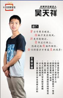 吴天祥,男,1995年01月23日出生,预备党员,现任12级土木2班生活委员兼心理委员、太阳成集团tyc7111cc科创中心竞赛组副组长。
