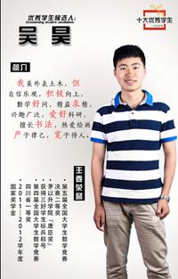 吴昊,男,1993年8月18日出生,共青团员。大学期间不仅注重于课内学习,还多次参加课外科研活动,以及体育活动。曾担任班级文艺委员。被评为“三好学生”。