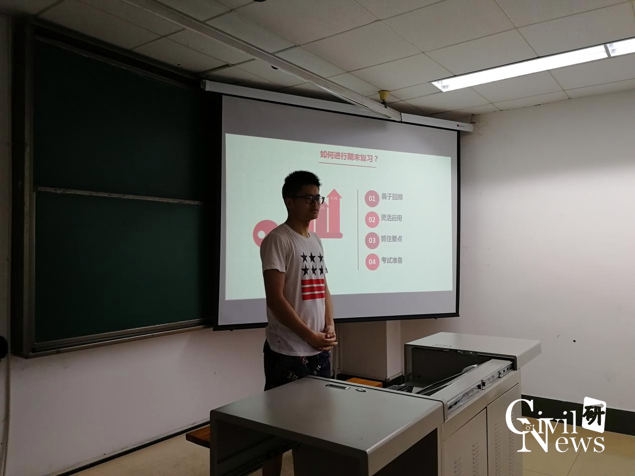 之后,学习委员付钰作为班级期末复习动员大会的主持人,为大家在复习之中应该制定的计划和目标为大家做了指引分析。付钰认为,班级同学在进行期末复习的时候,不应该只是为了考试而复习,而应该以贯穿学科知识线,牢固已学到的学问为目的,通过对学科的整体把握和细部框架认知,再加以灵活运用,就一定能取得好成绩。付钰对学习和复习过程中大家可能会出现的在时间和心态上的问题为大家做了开导,他认为我们应把握好自身在学习、科研和生活之间的关系,尤其是我们的学习应该为科学研究而服务但又不能仅限于闷头做研究,也得深入于实践,因此他鼓励同学们将理论和实践有机结合,参与实事、避免“纸上谈兵”。此外,付钰也对期末复习中同学们可能运用到的方法向大家做了精彩的介绍,经此一会,同学们有了方向和目的,也对于知识体系的巩固和期末考试的准备有了信心,极大的促进了同学们在这一学年末“勤学好学”的上进心,大家给与付钰同学热烈的掌声。