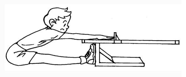 坐位体前屈是测试学生在静止状态下的身干、腰、髋等关节可能达到的活动幅度。受试者坐在连接于箱体的软垫上,两腿伸直,不可弯曲,脚跟并拢,脚尖分开约10-15厘米,踩在测量计垂直平板上,两手并拢。两臂和手伸直,渐渐使上体前屈,用两手中指尖轻轻推动标尺上的游标前滑(不得有突然前伸动作),直到不能继续前伸时为止。测试计的脚蹬纵板内沿平面为0点,向内为负值,向前为正值。以厘米为单位计取成绩,每人有两次比赛机会,取小数点后一位。