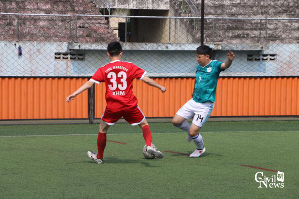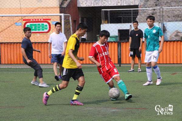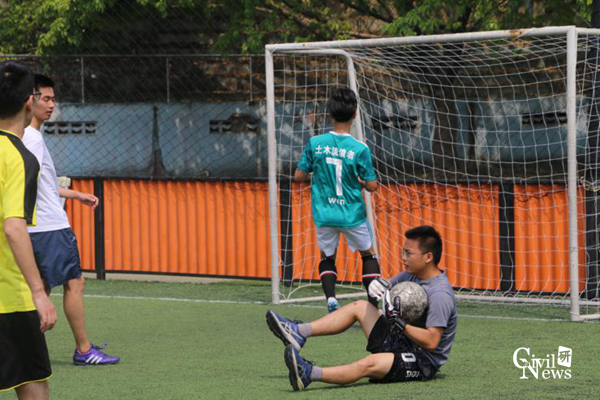 天气炎热,却遮挡不住足球场上球员的热情。随着裁判员一声哨响,比赛正式开始。上半场刚开始,结构队14号陈虹羽同学便以迅雷之势先进一球。之后,岩土队开始严密防守,但结构队攻势甚猛,7号文鸿同学又进一球,给岩土队造成了巨大的心理压力。经过激烈的角逐,岩土队8号王泽华同学进一球,为岩土队扳回一城。上半场结构队以2:1暂时领先。