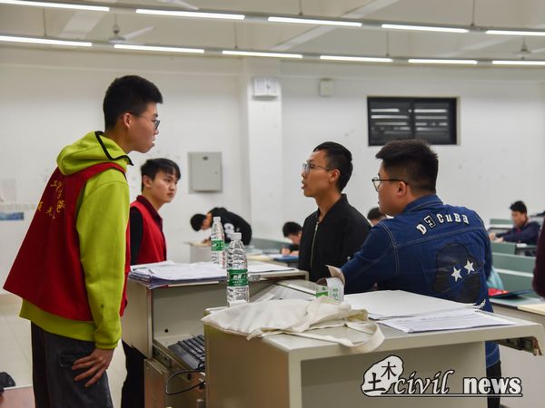 在图学技能大赛开始之前,科创中心的志愿者们忙碌地做着准备工作。临近开考,犀浦校区的96名参赛同学中的大部分已经陆陆续续来到考场,找到自己的位置并且安静地等待着考试,尽管有几位同学是在开考之后才陆续赶到,他们也是安安静静地走到自己地位置开始认真答题,没有去惊扰正在答题地同学,展现了交大学子良好的素养。考试期间,记者发现工作人员会很认真回答考生的疑惑并且尽量满足考生的需求,比如说有考生需要草稿纸,工作人员便立即上报。在竞赛过程中,同学们在考场保持安静,每个人都在努力思考,认真答题与作图,充分发挥交大人的聪明才智。