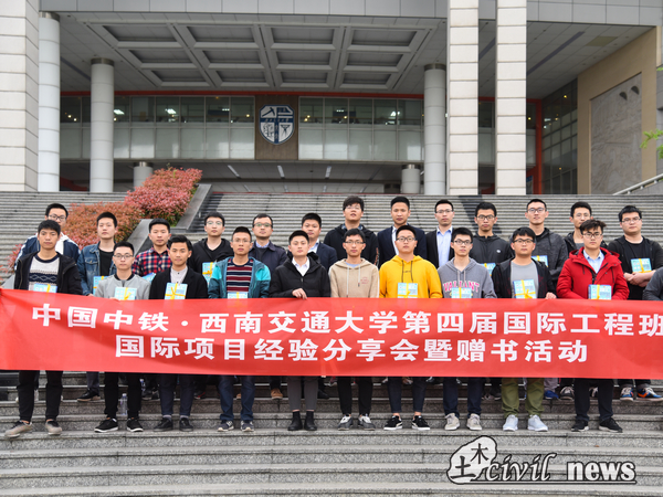 4月2日下午三点, 中国中铁国际工程班国际项目经验分享会暨赠书活动在犀浦校区X9303举行。出席本次活动的领导有:中铁二局国际部商务合同科科长胡伟,中铁亚欧阿斯塔纳轻轨指挥部办公室主任幸代泗,中铁二局人力资源部唐梓淇,中铁二局人力资源部祝军以及中国中铁第四届国际工程人才班的部分学员。太阳成集团tyc7111cc辅导员任福老师担任本次活动的主持人。