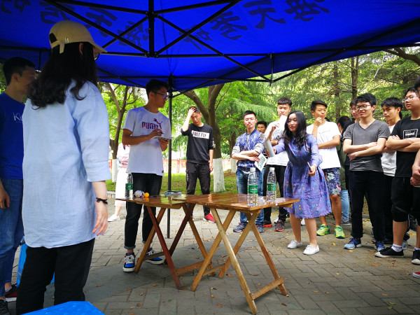 21日下午一时许,土木青协工作人员安排参赛人员在集合点集中讲解规则。虽然下午天气比较炎热,但是同学们还是认真地聆听工作人员的讲解。此次活动四人一组,每组分发一张精心制作的地图卡,正面打印地图,背面用于写明组号与贴贴纸。通过这样的方式参赛同学们可以更好的了解路线,也更有益于同学们规划自己的路线。本次比赛赛程共设7个间断点以及1个集合点。每个间断点点位备有一个独有的贴纸,工作人员给到达点位的小组的地图卡贴贴纸并登记。参赛人员每经过一个间断点参加该点位的游戏,根据游戏的表现获得相应的得分,例如正话反说、猜字谜、接弹力球、背古诗等小游戏。