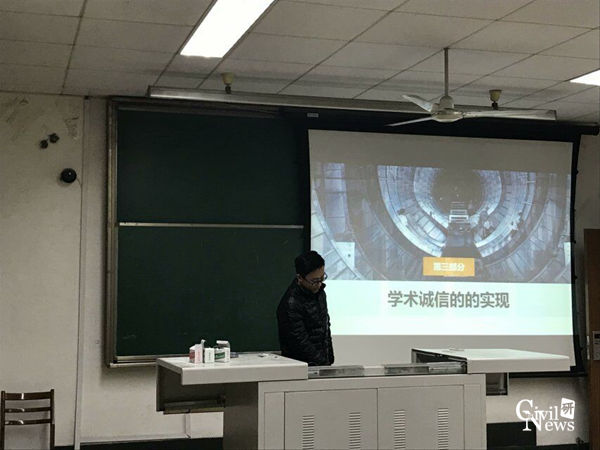 首先,荆祥同学用四个例子阐述了目前世界上存在的学术诚信缺失现象。荆祥同学谈到了捏造实验数据、论文抄袭、窃取别人的成果等都属于学术诚信缺失。