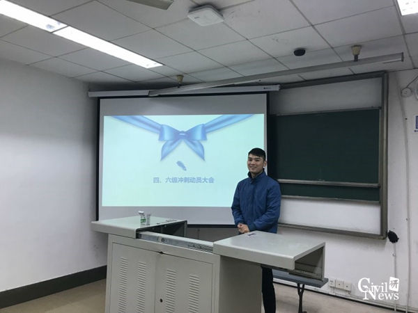 首先,荆祥同学为大家介绍了此次“四六级动员大会”的活动背景。荆祥同学谈到研究生生活已经度过半个学期,在给班级营造出热爱学习、互相帮助、思维活跃的氛围的同时,同学们之间也应该加强学习及科研进展情况的交流,在等级考试上多下功夫,多拿证书,为将来工作准备筹码。此次活动的目的是希望通过此次活动能够引起大家对英语学习的重视,提高英语四六级的通过率,促进同学们的英语应用能力与学术英语水平。并对马上到来的四六级考试有足够的重视。努力准备,沉着应考,争取在此次的四六级考试中取得优异的成绩。