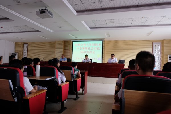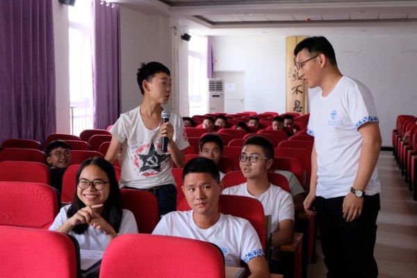 8月15日8:00,社会实践团的成员们来到了福泉中学报告厅,稍作准备后开始了本次活动培训会。首先是罗绍良校长发言,为各位高一的同学们介绍实践团的概况,由福泉中学的来历引入话题,希望他们借这个契机学习到课本以外的知识经验,与学长们多多交流,殷殷期盼不绝于耳。随后,实践团的带队老师冯霄暘博士讲话,向福泉中学对本次活动的大力支持表示衷心的感谢,还亲切地与同学们交流问答,充满关心和期待,现场气氛逐渐走向活跃。