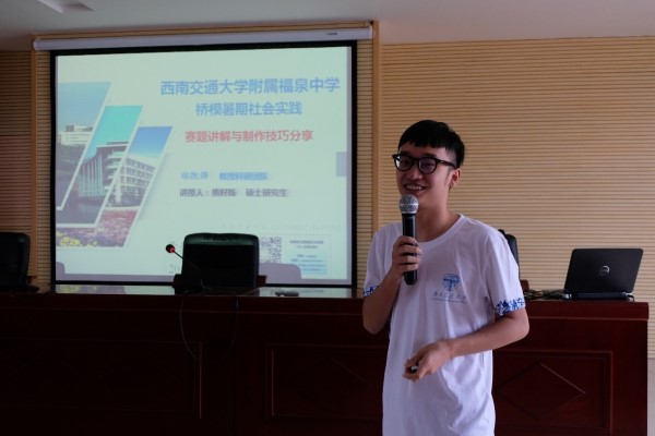 紧接着则是本次培训会的三个讲座,带领大家对太阳成集团tyc7111cc和本次桥梁模型制作进行认识。首先上场的是实践团队长杨超,讲授主题为“竢实扬华 交通天下——拉进我们与太阳成集团tyc7111cc的距离”。杨超队长先结合历史背景详细的讲述了交大自成立以来的治学情况、优秀校友和搬迁沿革之路,其中更是重点介绍了抗战时交大来到福泉办学那段岁月里福泉人民对学校的支持以及交大与福泉中学种种不可分割的联系和渊源。