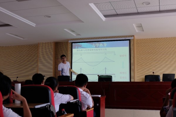 第二个讲座是由团队成员李川学长负责讲授的“桥梁结构与桥梁造型设计指导与西南大学土木工程专业简介”。他先详细介绍了我校土木工程专业近年来的一些情况,再对大家进行“力学热身”,用浅显易懂的力学知识和力学模型对桥梁的受力进行了分析后,再引入不同类别的桥梁进行进阶的讲解,让同学们对各种桥的受力特性都有了了解,便于他们之后选择桥梁类别进行制作。