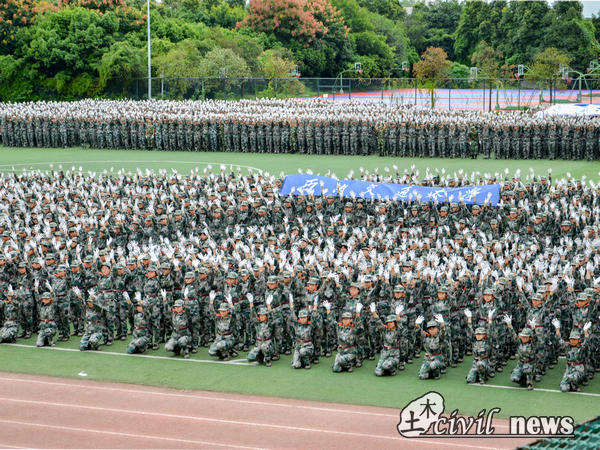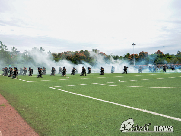 擒敌拳、军体拳、匕首操表演搏得了全场喝彩。最亮眼的表演无疑是女兵连队带来的擒拿术表演和烟雾中的实战表演,英姿飒爽的女孩们展现了不一样的风采。由全体女生连队组成的表演方阵也在结业典礼上精彩亮相,通过肢体语言拼凑出“交大、你好”等字样。亮丽的形象、整齐的动作、精彩的表演,无不体现出新一代交大人的风貌。