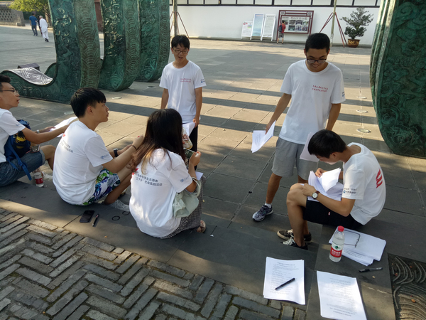 8月6日下午,志愿者们顶着烈日重新对古城里以及其周边街道再一次进行覆盖式的问卷调查,这次共为三个小组,分别针对游客、商家、市民。面对这次调研活动最后一次外出调查,每一个人都斗志昂扬、格外积极。一边抹着汗,一边又认真寻找着各自的调查对象。五点半,大家在贡院前集合,这次的成果丰厚,汇总整理后便结束了户外的问卷调查环节。