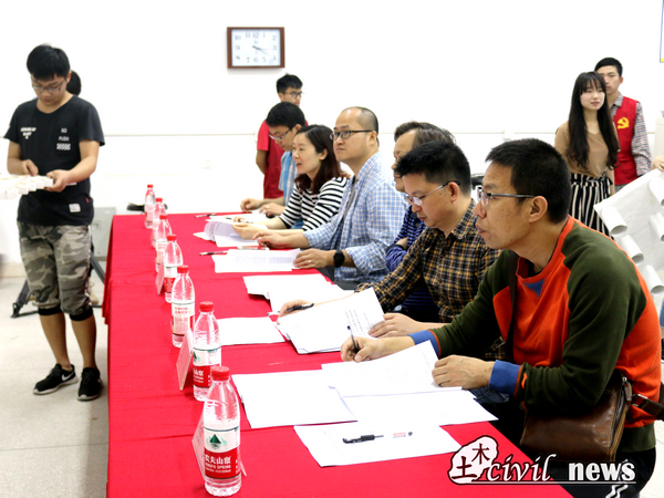 今天到场的评委老师有陈德、张家玲、杨荣山、刘昌清、杨明、郭力康、张良。本次比赛一共有38个组参加,上午进行18个组,剩下的20个组则在下午进行比赛。
