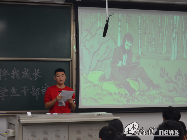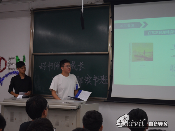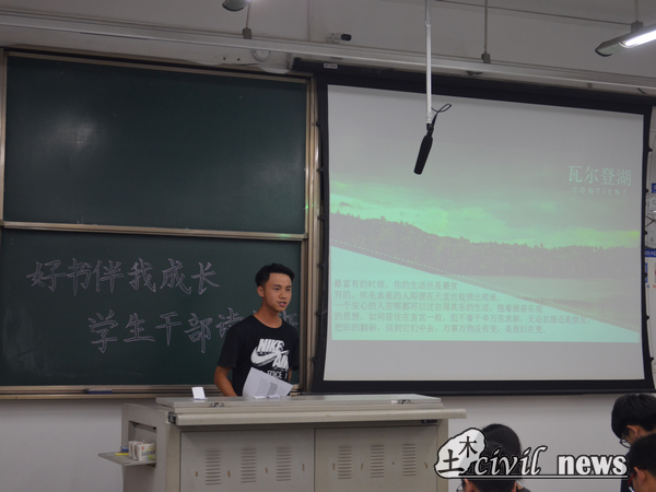 第一位上台发言的是团建中心的李沛键,他首先介绍了《瓦尔登湖》的作者梭罗的生平简介和创作的时代背景。毕业于哈佛大学的梭罗没有选择过安稳的生活,而是到瓦尔登湖畔过着一种原始生活,有了自己的亲身经历,梭罗最后完成了巨作——《瓦尔登湖》。