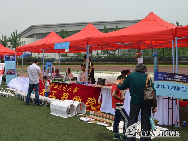 学院的工作人员们早早地便到了指定地点进行场地布置,期间刘萍辅导员也到了现场参与会场布置。11点活动正式开始,本次嘉年华中土木学院共筹备了两项活动。其一是优秀作品展示,其中包括了土木科技月的优秀作品以及我校参与第四届四川省大学生结构设计竞赛的获奖作品。各式各样的作品摆满了会场,吸引了许多师生及校友前来观看。