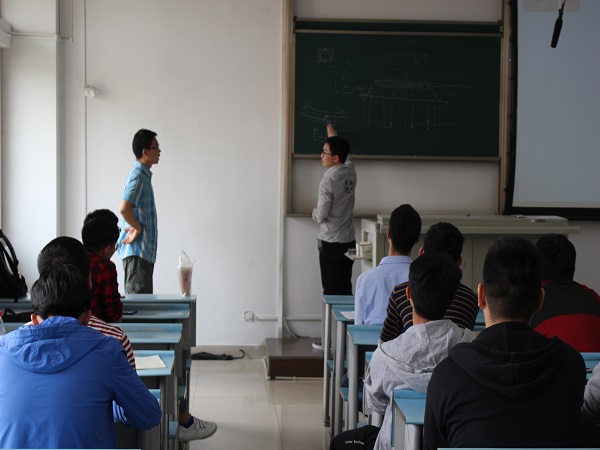 现场的气氛活络了起来,问题也越来越专业,有的地方说不清楚的,陈老师也请同学们上台来通过画图来沟通,这样的交流方式不仅有效而且更直接,陈老师跟同学在黑板上画图的样子看起来不像一个老师,更像大家的一个益友。
