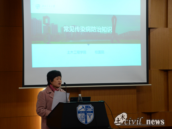 在这次讲座中,唐医生先用关于各个月发病水平来直观地说明为什么11月要特别注意卫生防控,11月发病水平多余其他月,而在各大高校中,水痘,肺结核是经常出现的传染病。唐医生将水痘的症状与肺结核的政治具体描述出来,并提醒同学们如果身边的人出现了这种状况一定要及时就医。唐医生还向同学们讲述了这两种传染病的发病原因,并举例来向同学们解释及时就诊的重要性。