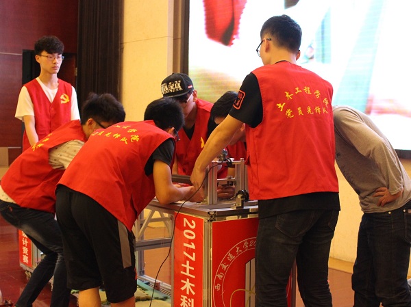 5月20日上午8点半,桥梁承重和桥梁造型比赛正式开始,栗怀广、张锐、邓开来等老师作为评委出席。