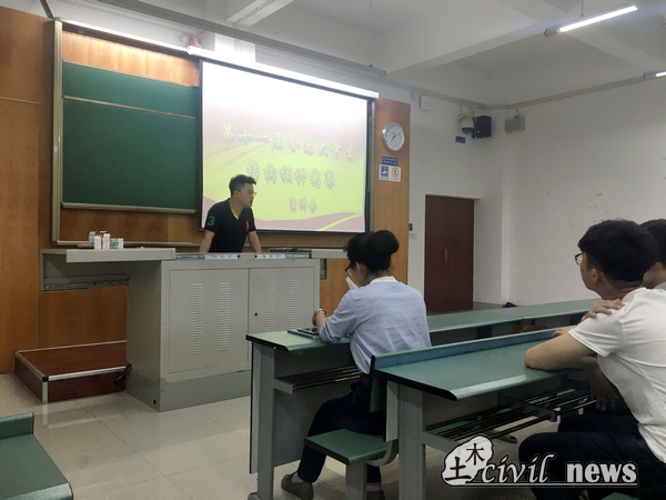 随后,由我校获得上一届大学生结构设计竞赛一等奖的三位同学——王皓正、张金龙和王凯来为大家传授经验,分享感受。首先进行讲解的是作为队长的王皓正,他从模型的设计原则讲起,到制作技巧,再到做好模型的几个关键点,讲解内容几乎面面俱到。他提到,我们要学会“一看、二算、三做、四改”,要多看论文,看别人的结构,看现有建筑,再结合自身模型才能想出最好的设计方案。除此之外,制作前要用相关软件计算参数,能节省力气并做到心中有数。