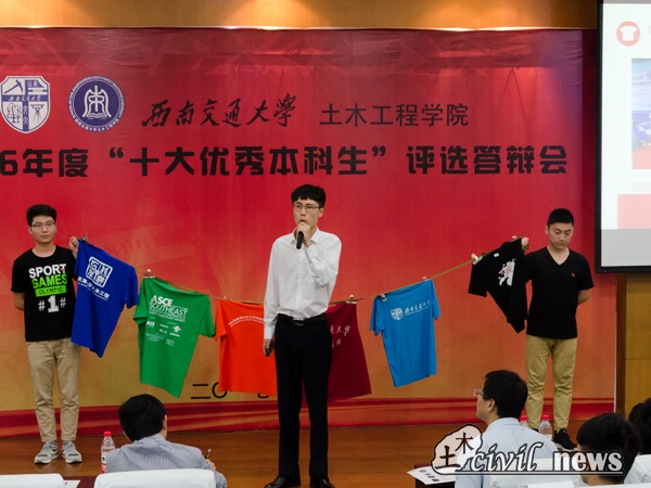 来自14级土木17班的王皓正以“五件背心”为主线进行了答辩。他通过介绍五件背心的来历讲述了自己在竞赛学生工作上的成就,这五件背心也见证了他的成长与蜕变。从学科竞赛到申请专利,从社团常委到国家奖学金,他用傲人的成绩证明了自己。他曾代表西南交大勇夺全国大学生结构设计竞赛一等奖,也曾在大洋彼岸的美国ASCE钢桥比赛上为国争光。他是自称“皓正王”的阳光青年,也是自称“没有特长,这些都是我的强项”的自信小伙。