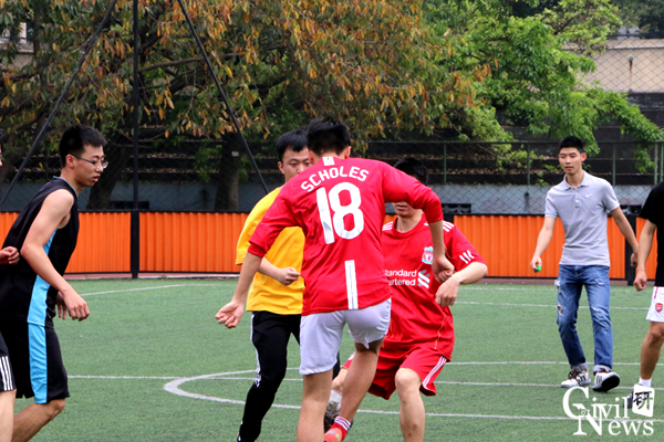 烈日灼灼,热浪滚滚,却丝毫没有打消队员们的热情。12点30分,队员们整装待发。随着裁判的一声哨声,球场上顿时沸腾起来。专硕结构选手不断进攻,精准的传球,激烈的快攻,引得场边阵阵掌声,在上半场主力队员王子超赢得一球。在下半场比赛中,岩土主力选手在助攻手漂亮的弧线球下,一个灵巧的转身,赢得了决定性的一球,比赛战平。此后,比赛达到了高潮。岩土队气势大增,持续发起攻势,又取得了一球。而专硕结构也不甘示弱,连连防守进攻,在比赛还有最后一分钟的时候,主力队员文鸿将比赛得分扳平。最后,两队以2:2打平。