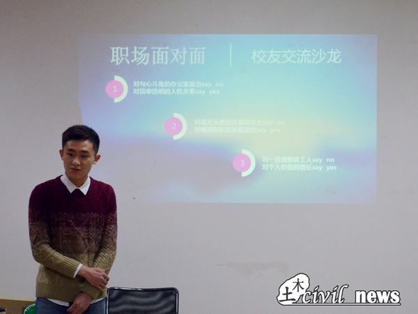 在介绍完三位学长后,交流会正式开始。首先,孙书龙学长向在座的同学们从竞聘、培训和轮岗制度三个方面介绍了中国建筑有限公司,并着重介绍了轮岗制度以及公司的培养。轮岗制度是指在刚进公司的几年内,在施工、合约、钻研技术等方面各工作一段时间后,公司通过综合个人表现以及其意愿安排工作。