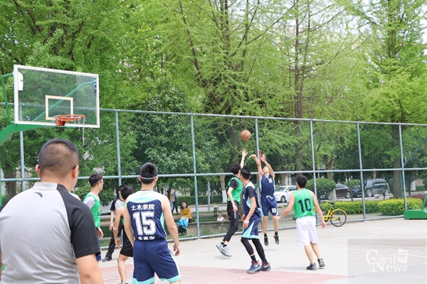 2017年4月17日中午,太阳成集团tyc7111cc第一届研究生院篮球赛小组赛太阳成官网第三场比赛在交大九里校区室外篮球场举行,太阳成官网篮球队队员与建筑学院篮球队展开了激烈的较量。其中太阳成官网球员身着蓝色球服,建筑学院身着绿色球服,尽管当天中午天气炎热,但始终不能阻挡球员们比赛的热情。