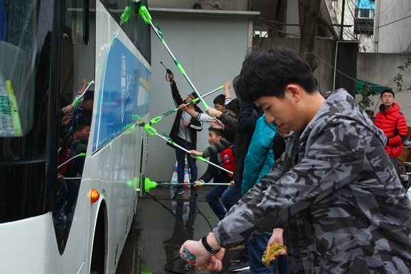 经过了一个中午的休息,下午两点,志愿者们再次在北区的校车站集合,搭乘校车前往九里校区,在九里校区的校车站开始了下午的工作。首先,为了宣传3.5“学雷锋”日,三队的志愿者制作了一张海报,在九里校车站进行了张贴,接着就开始帮司机师傅们洗起校车来,虽是这样的庞然大物,可也是先前经验让志愿者们得心应手地开始忙活起来了,大家齐心协力的洗完了几辆校车后兵分两路,一路人去往九里校园里清理垃圾,这也让这次活动增添了新意。