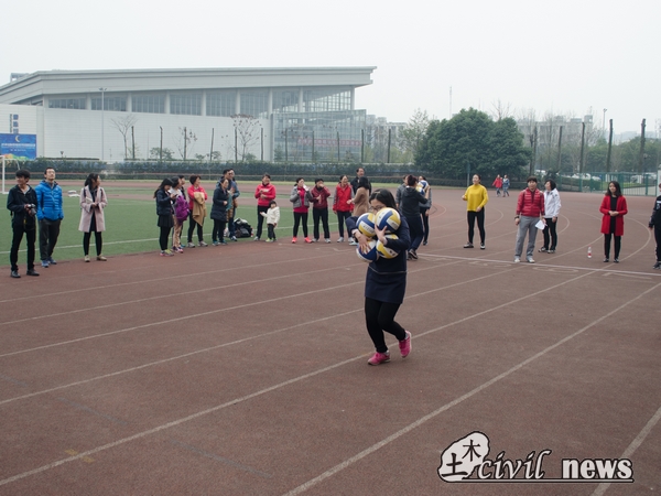 土木学院共有七名女老师参加比赛,首先参加的比赛是集体跳绳。两人摇绳,七名老师同时起跳,为了增加默契度,她们每喊一个口号便步伐一致的往上跳。抛开平日里沉重的工作和繁琐的家务,她们在属于自己节日的这天尽情挥洒汗水,活力十足。土木代表队在集体跳绳这个项目中收获了一分钟跳46个的好成绩,位列第三。第二个比赛项目是两人三足,两位老师并排站立,用绳子同时绑住一人左腿和一人右腿的脚踝处,两人同时行走,来回接力。在这个比赛中,有老师不慎绊倒,但是没有放弃并依旧坚持到达了终点。老师们认真投入,在两人三足上也取得了不错的成绩。最后一个参加的比赛是运球接力跑,同样是接力比赛,在距离二十米处手抱四个排球交给对面队友,用时最短即为获胜。对于女老师来说,同时抱起四个排球并不是一件容易的事,但是她们拧成一股劲,都表现出了顽强的运动精神。一来一回的奔跑,尽管并不容易,但每一步都很有活力和冲劲。