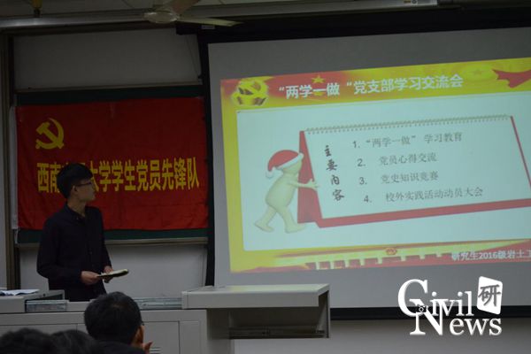 本次的党支部特色活动由党支部学习交流会和校外实践两部分组成,整个活动由岩土一班党支书秦晓同同志主持。在学习交流会上,党支书秦晓同同志首先就如何深入学习“两学一做”作了报告,他讲到“基础在学,关键在做,要进一步增强党员的意识,提高党员的党性觉悟,坚定正确的政治方向,勇于担当,在生产、工作、学习和社会活动中起先锋模范作用。”