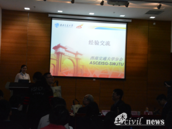 随后,同济大学、重庆大学、河海大学分别就各自学校的ASCEISG组织结构进行了介绍。我校ASCEISG-SWJTU主席韩嘉怡同学也对我校ASCEISG成立以来的各项活动——SRTP讲座、北川地震遗址考察、ASCE竞赛宣讲及选拔等做了详尽的汇报,其中她在汇报中所提及的“工程师的情怀”获得了与会嘉宾的一致好评。