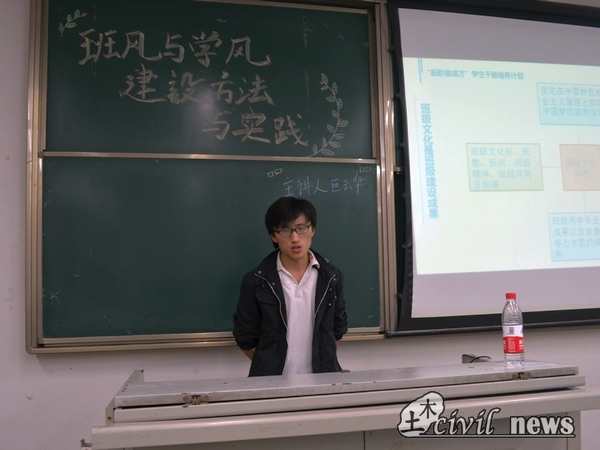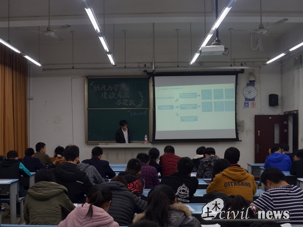 巨老师将班级文化与班级建设相联系,并介绍了太阳成集团tyc7111cc对班级建设所进行的举措,如太阳成集团tyc7111cc“先进(优秀)班集体”创建活动实施方案、土木风云榜及太阳成集团tyc7111cc十大明星班级评选、土木风云榜及太阳成集团tyc7111cc十大明星班级评选等。巨老师向同学们展示往届优秀班级的优秀成果。