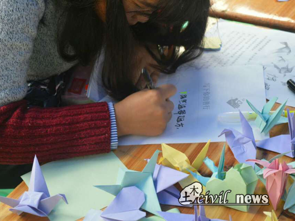 正式活动时,志愿者们早早到达了指定地点,开始了活动前的准备。活动主要分为三部分:“写下你的善行”——虽然现在的我们没有顶天立地的能力,也不能做什么惊天动地的大事,但是生活中每一件小小的善事都是值得骄傲的;“为孩子们折纸”——亲手为爱心小学的孩子们做一件小手工(看,国际友人都来帮忙啦);“横幅签名”——留下你的名字,证明你曾经来过。
