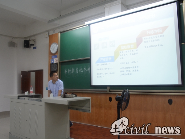8月28日,土木学院举行了新生入学教育中的“本科教育规范解读”讲座。主讲人为土木学院辅导员王若羽、梁喻嘉等。