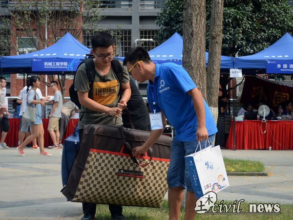 下午,报道的新生数量依旧不减。在这一波又一波的新生潮中,土木迎新点前出现了许飞校长和陈志坚副书记等的身影。徐校长和李锦红书记一起查看了土木迎新工作的进展,并在土木迎新点处逗留了许久。许飞校长在和李书记的谈话中提到,今年迎新的任务艰巨,土木专业一共要招1000人左右;同时峨眉校区的迎新工作要和犀浦一视同仁,甚至还要更重视峨眉方面的工作。