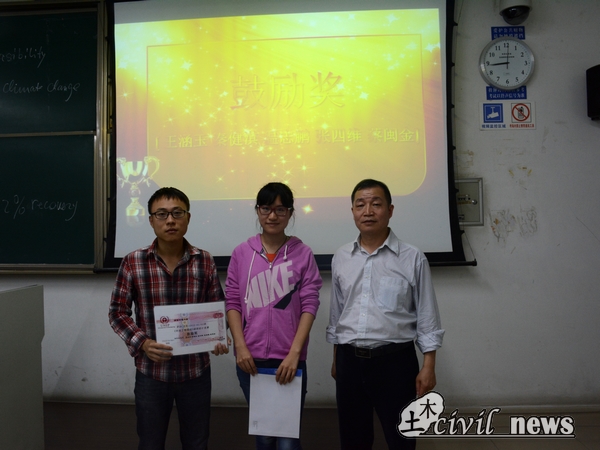 5月13日,2012级茅以升学院土木1、2班关于《环境工程基础》课程设计竞赛的颁奖典礼在X2427隆重举行。参加本次颁奖典礼的嘉宾有工学博士、博士生导师杨顺生教授,本科办创新办公室主任梁老师以及资助本次竞赛的企业代表吴高工。同时,跟随杨老师而来的两位德国留学生也参加了此次颁奖典礼。