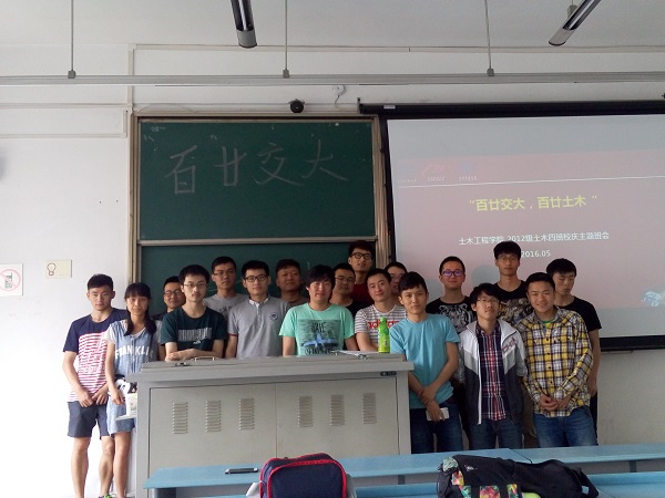 5月13日下午2点,12级土木四班在X2534召开了“百廿交大,百廿土木”的主题班会,由班长郑好主持,班上大部分同学都积极参加。