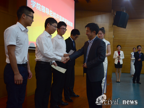 随后,此次答辩活动的获奖结果出炉,李锦红副书记宣读了获奖名单。经过前期的网络投票和现场评选,刘川昆、葛良福、惠术、张乾、黄道兴、李轶贤、杨得海、尤星源、郭文琦、马东华和唐庆等11名同学获得土木学院2015到2016年度“十大优秀本科生”荣誉称号(其中马东华和唐庆并列),刘翔宇、王顺意、徐航和刘强等4名同学获得提名奖。钱永久书记亲自上台为获得“十大优秀本科生”称号的同学颁奖,祝贺他们取得的成绩,也希望他们再接再厉,再创佳绩。