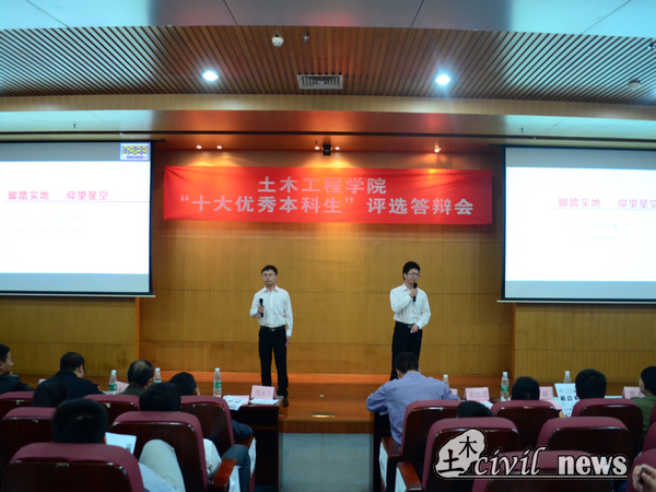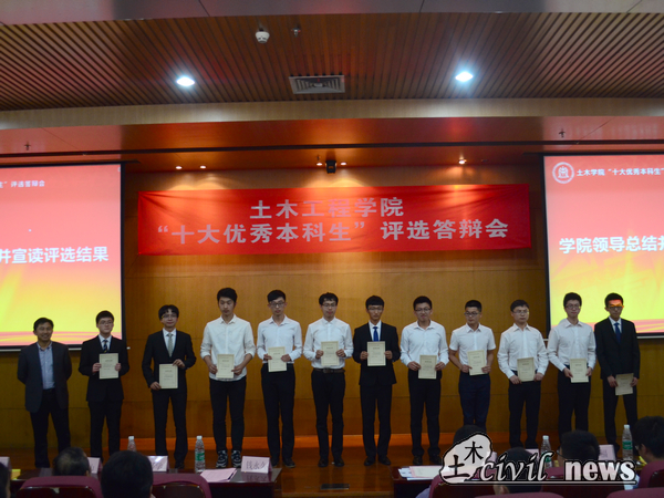 本届答辩会请到了土木学院书记钱永久、副书记李锦红以及一批导师和辅导员们作为嘉宾,与来自各个年级的班长和团支书们作为评委。当晚,他们在15个百里挑一的候选人中选出了十名同学获得土木学院2015到2016年度“十大优秀本科生”称号。