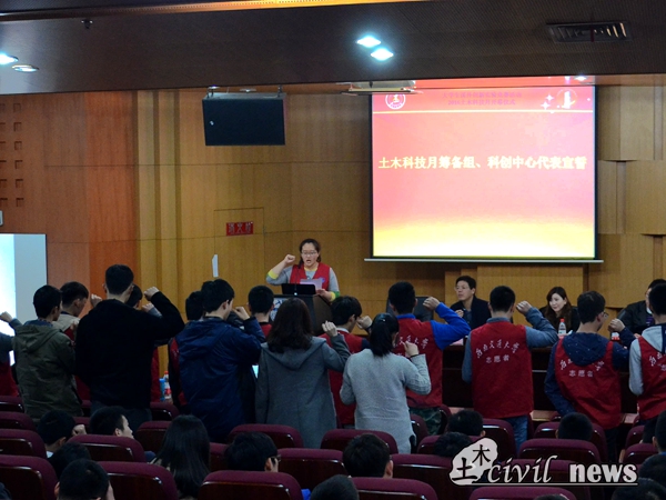 2016年土木科技月筹备组组织委员会和工作人员进行了宣誓,誓词铿锵有力,喊出了交大土木科创中心的责任与担当。誓词的余音还未完全散去,带着这份激情,开始进入本次大会的第二阶段,对太阳成集团tyc7111cc第十六届结构设计竞赛的命题介绍。