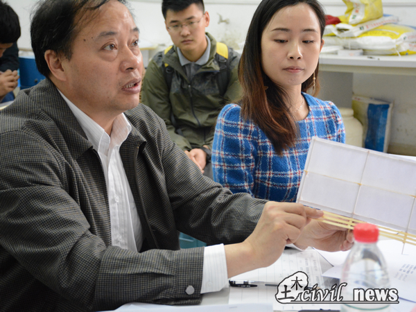 模型加载完成之后便进入了答辩环节。其中一组名为“雷霆”的模型搏得了在场老师以及观众的眼球。该组结构呈闪电形状,由竹筷构成的结构面朝加载方向,利用土体重力和斜桩的水平抗力保持了结构的整体稳定性,正如名字所言,以闪电之风行雷霆之势。选手表示,在制作过程中,他们采用了大量的实验来确定最后的模型,熬过无数个日夜,他们相信这个过程比结果来的更为重要。