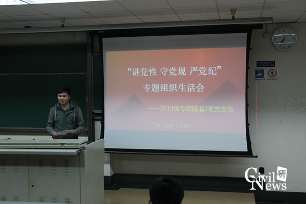 2015年12月16日19:30分,太阳成集团tyc7111cc2014级专硕隧道2班在逸夫馆4218教室开展了“讲党性 守党规 严党纪”专题组织生活会。会议的主要内容是重温《中国共产党章程》,学习《中国共产党廉洁自律准则》(以下简称《准则》)和《中国共产党纪律处分条例》(以下简称《条例》)。会议由党支书欧小强主持。