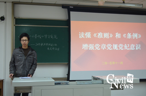 12月13号下午两点,在逸夫馆4320,14级专硕桥梁2班全体党员在党支书朱元奇的带领下,一起学习《中国共产党廉洁自律准则》和《中国共产党纪律处分条例》。并新颁布的《准则》,《条例》进行了交流探讨。