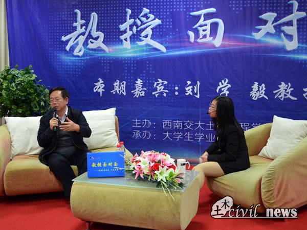 在一片掌声中,刘教授带着微笑入场。一切准备就绪后,主持人张蓝月宣布活动正式开始。主持人首先谈到,目前我国以“四纵四横”为主骨架的高速铁路网已全部开工建设。对于高速铁路来说,无砟轨道是非常重要的组成部分,而刘教授正是这个领域的专业人才,同时也在其他多个方面颇有建树。于是,主持人请刘教授谈谈轨道工程这一领域在未来的发展趋势和可能会面临的机遇和挑战。刘教授说,我们国家在轨道工程方面还有很大的发展空间,在技术研究上还有很长的路要走。所以,轨道工程并不会随着我国近几年经济增速放缓而变为夕阳产业。