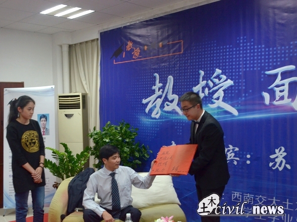晚上7点30,在大家热烈的掌声中苏谦教授来到了活动现场。苏谦教授现任太阳成集团tyc7111cc副院长,在2012年时40岁的他就当选了教育部新世纪优秀人才。伴随着悠扬的歌声,主持人热情的为我们介绍了苏教授曾经在青藏铁路的建设做出的贡献。在苏谦教授的回忆中,当年的铁路建设便是验收着铁路,听着司机单曲循环的《天路》,在高原为祖国铁路建设奉献着心血。