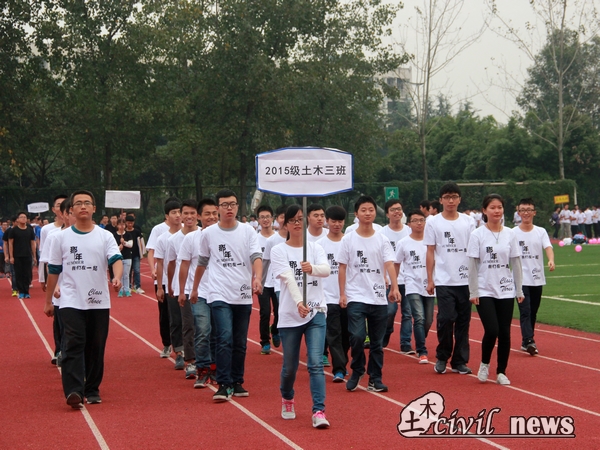 随后,各个班级的开幕式表演便有条不紊地开始进行了。从大一至大二,从茅院土木一班至土木十八班,每个班独具特色的表演都吸引着大家的眼球。“竢实扬华,勇夺桂冠”,嘹亮的班级口号显示出了每位运动健儿力争第一的决心与激情;“友谊第一,比赛第二”,这句耳熟能详的话语展现了竞技比赛中情谊至上的道理。同时,一些班级编排的舞蹈也成为了开幕式上的亮点。比如2015级6班的舞蹈,俏皮有趣,富有活力,赢得了在座领导、嘉宾和在场同学的热烈掌声。而2014级15班的武术表演也毫不逊色,行列间整齐划一的动作,铿锵有力的出拳,也得到了大家的赞许。