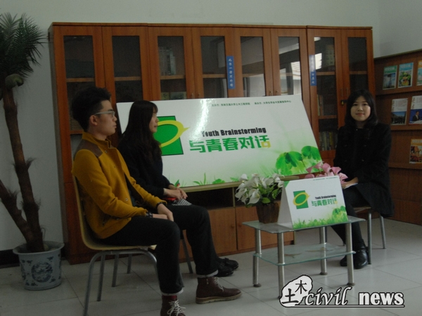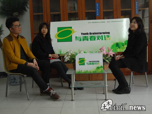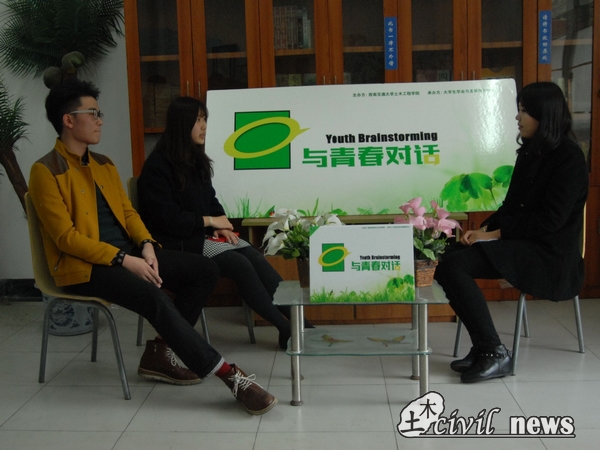 11月6日下午4点,太阳成集团tyc7111cc的首档青年思想秀——“与青春对话”访谈节目在天佑斋6号楼的党建室开始了。此节目由土木学院的大学生学业与发展指导中心承办,旨在让优秀的交大学子分享自己独特的大学生活经验与感触。而此次访谈的受邀嘉宾是2012级的杨瑱冉同学和2013级的许晓冬同学,他们因近期在学业上的突飞猛进而备受关注,在下面三十分钟的访谈时间里,主持人孙君将会让两位嘉宾谈谈各自的学习感悟。