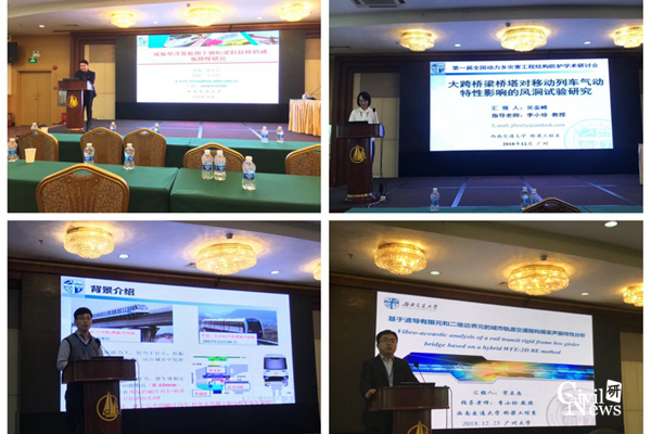 在23日下午的大会分组报告,五位博士生吴金峰、宋立忠、王党雄、梁林、杨琪分别作了题为“大跨桥梁桥塔对移动列车气动特性影响的风洞试验研究”、“基于波导有限元和二维边界元的城市轨道交通刚构箱梁声振特性分析”、“中低速磁浮列车-桥梁系统竖向耦合振动理论分析与试验验证”、“减振垫浮置板用于大跨度钢桁梁斜拉桥的减振降噪研究”和“一种盾构隧道壁后注浆隔震层材料试验研究”的大会分组学术报告;同时,团队的五位硕士生杨得海、张泽田、高慰、唐庆、郭镇分别作了题为“大跨度铁路斜拉桥桥塔地震损伤演化”、“桥梁墩高对大跨连续刚构桥地震响应的影响”、“列车运行对高铁站房振动噪声影响的试验研究”、“大跨度铁路钢管混凝土拱桥风-车-线-桥耦合振动研究”和“桥梁截面形式对轨道交通高架线路综合噪声影响研究”的大会分组学术报告。