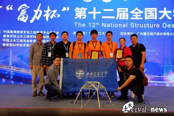 2018年11月11日,“富力杯”第十二届全国大学生结构设计竞赛在华南理工大学落下帷幕。经过四天紧张的现场制作、现场答辩及加载测试,由我校土木学院建筑工程系郭瑞、周祎任指导教师,余志祥任指导小组组长,李力任指导顾问,叶高宏、郑浩宇、周豪三名同学组成的西南交大代表队获得了本届全国大学生结构设计竞赛一等奖,此外,我校还获得各省、市自治区秘书处优秀组织奖。这是继我校在第三届(2009年)、第五届(2011年)取得了特等奖(第一名)后,第五次获得全国一等奖(2013年第七届、2014年第八届、2015年第九届、2016年第十届),至此我校共获得了两次特等奖、五次一等奖,六次优秀组织奖,在全国高校中遥遥领先。